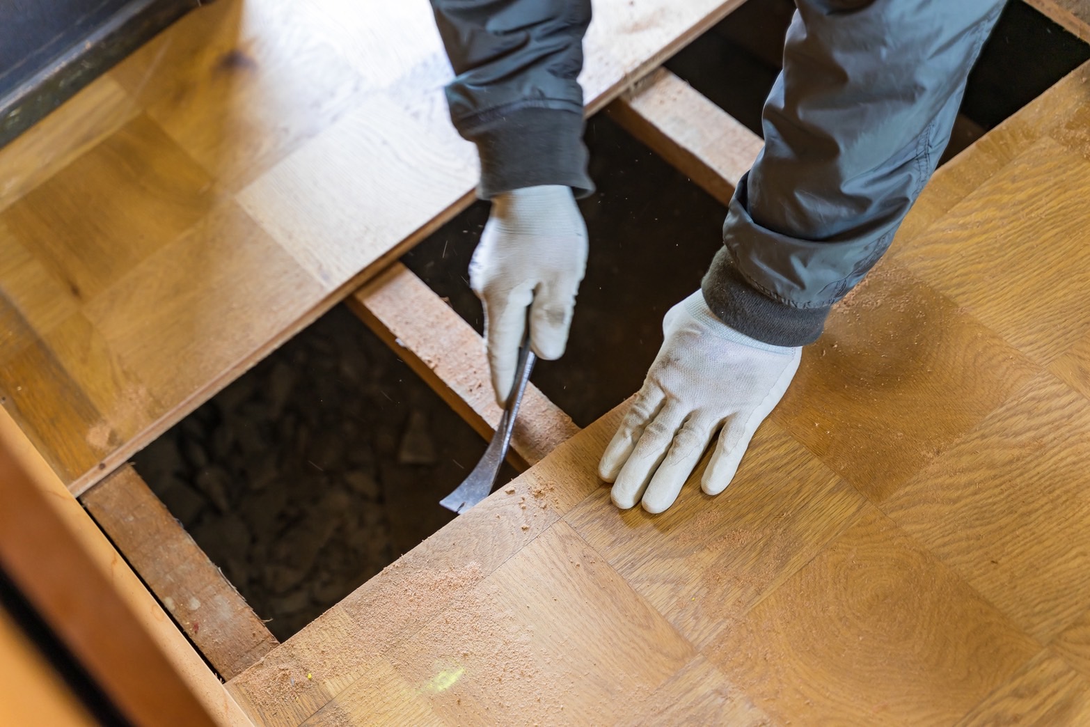 現場は夏場で臭気が強く、畳・床下・壁面に体液の浸透が確認されました。