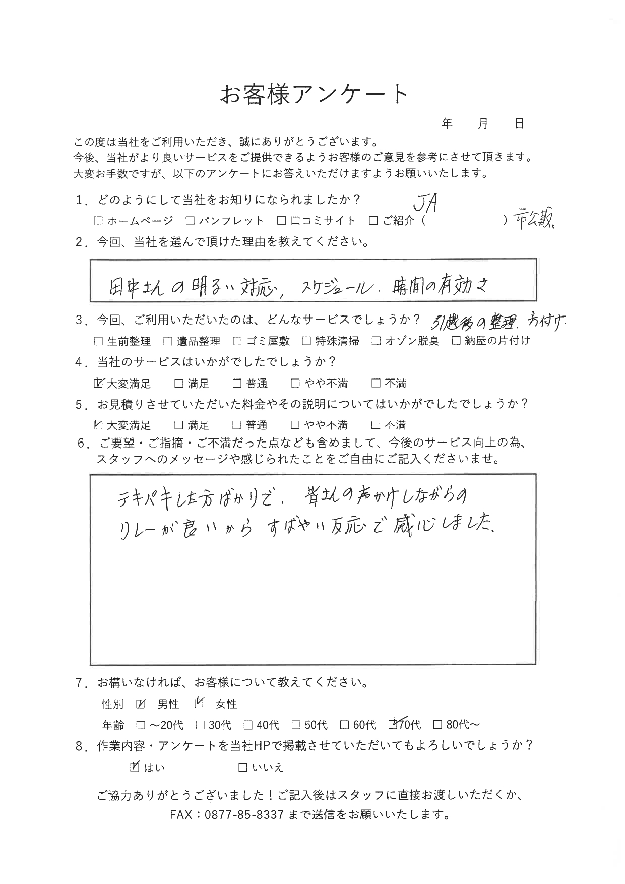 カテゴリー: 空き家の片付け 一覧 2025.08.01 空き家の片付け 高松市 ★★★★★ 高松市で引越し後の空き家の片付けをご利用のお客様の声 テキパキした方ばかりで皆さんの声かけしながらのリレーがい... ... 詳しくみる 2023.11.29 空き家の片付け 三豊市 ★★★★ 三豊市で空き家の片付けをご利用のお客様の声 見積もりに来てくださったスタッフの方が作業当日も来てくだ... ... 詳しくみる 2023.01.14 空き家の片付け 高松市 ★★★★★ 高松市で生前整理・空き家の片付けをご利用のお客様の声 色々整理できて良かったです。 安くしてもらって良かったです。 ... 詳しくみる 2022.05.31 空き家の片付け 高松市 ★★★★ 高松市で空き家の片付け・生前整理をご利用のお客様の声 男性5人が手際よく大きな荷物を運んでくれて、女一人では無... ... 詳しくみる 2022.05.23 空き家の片付け 高松市 ★★★★★ 香川県高松市で空き家の片付けをご利用のお客様の声 たいへんありがたく思っています。 ... 詳しくみる 2022.05.11 空き家の片付け 多度津町 ★★★★★ 多度津町で空き家の片付けをご利用のお客様の声 担当者の方が感じが良くて、何でも相談できそうに思いました... ... 詳しくみる 2021.11.22 空き家の片付け 高松市 ★★★★★ 高松市で空き家の片付けをご利用のお客様の声 みなさんていねいにさいごまで片付けをしていただいて、大変... ... 詳しくみる 1