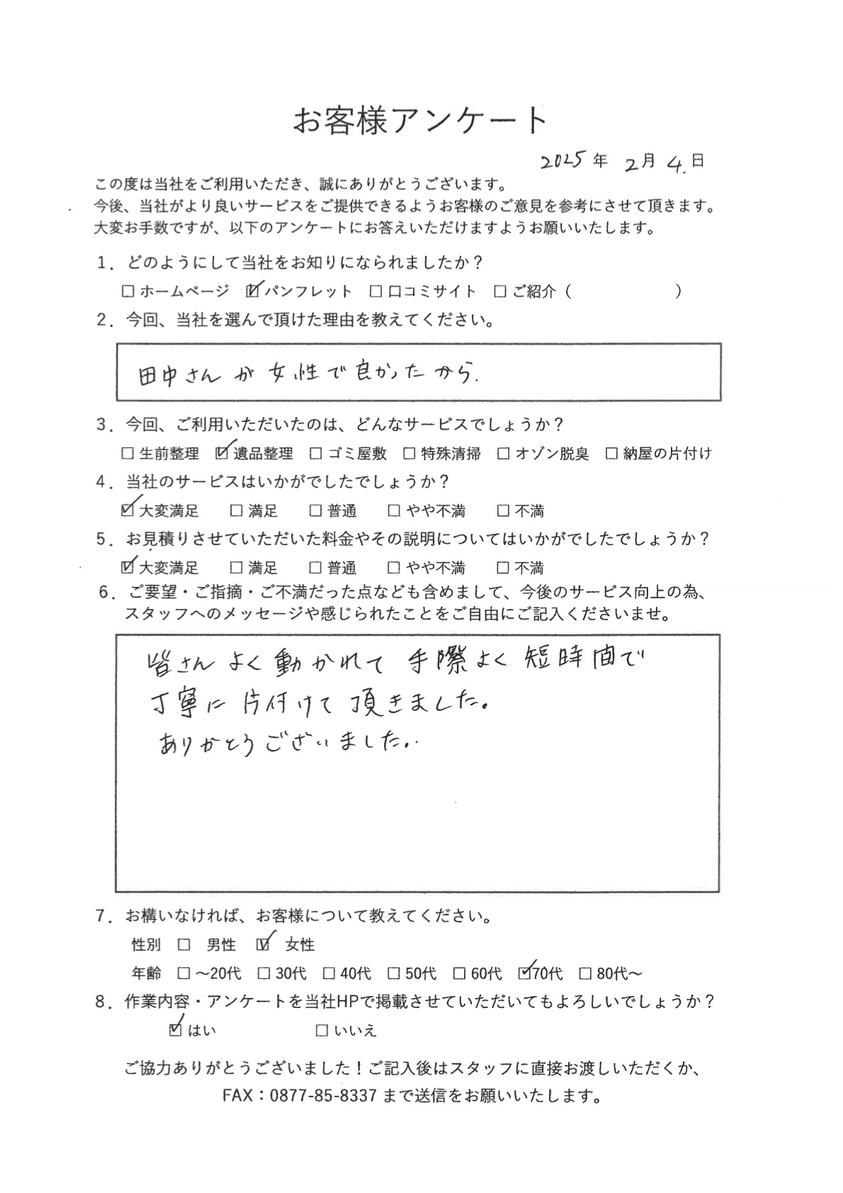 月: 2025年2月 2025.02.21 ゴミ屋敷清掃 さぬき市 ★★★★★ さぬき市でゴミ屋敷片付けをご利用のお客様の声 とても素早く丁寧な仕事でした。 ありがとうございました。 ... 詳しくみる 2025.02.18 納屋の片付け 三豊市 ★★★★★ 三豊市で納屋の片付けをご利用のお客様の声 広くなり、スッキリしました。 良かったです。 ... 詳しくみる 2025.02.04 遺品整理 高松市 ★★★★★ 高松市で遺品整理をご利用のお客様の声 皆さん、よく動かれて、手際よく短時間で、丁寧に片付けてく... ... 詳しくみる 1