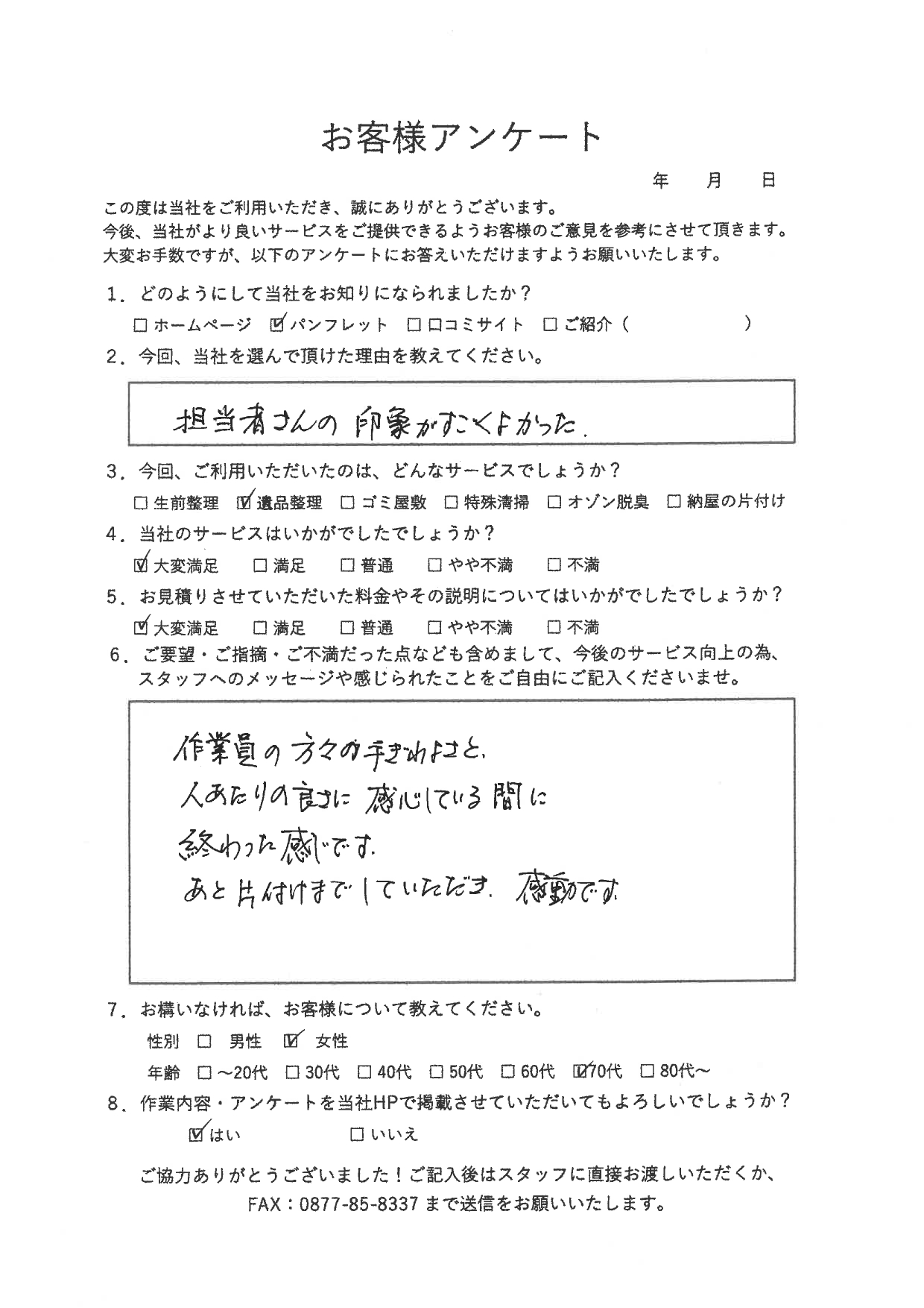 月: 2025年10月 2025.10.10 遺品整理 丸亀市 ★★★★★ 丸亀市でマンションの遺品整理をご利用のお客様の声 作業員の方々の手際の良さと人当たりの良さに感心している間... ... 詳しくみる 1